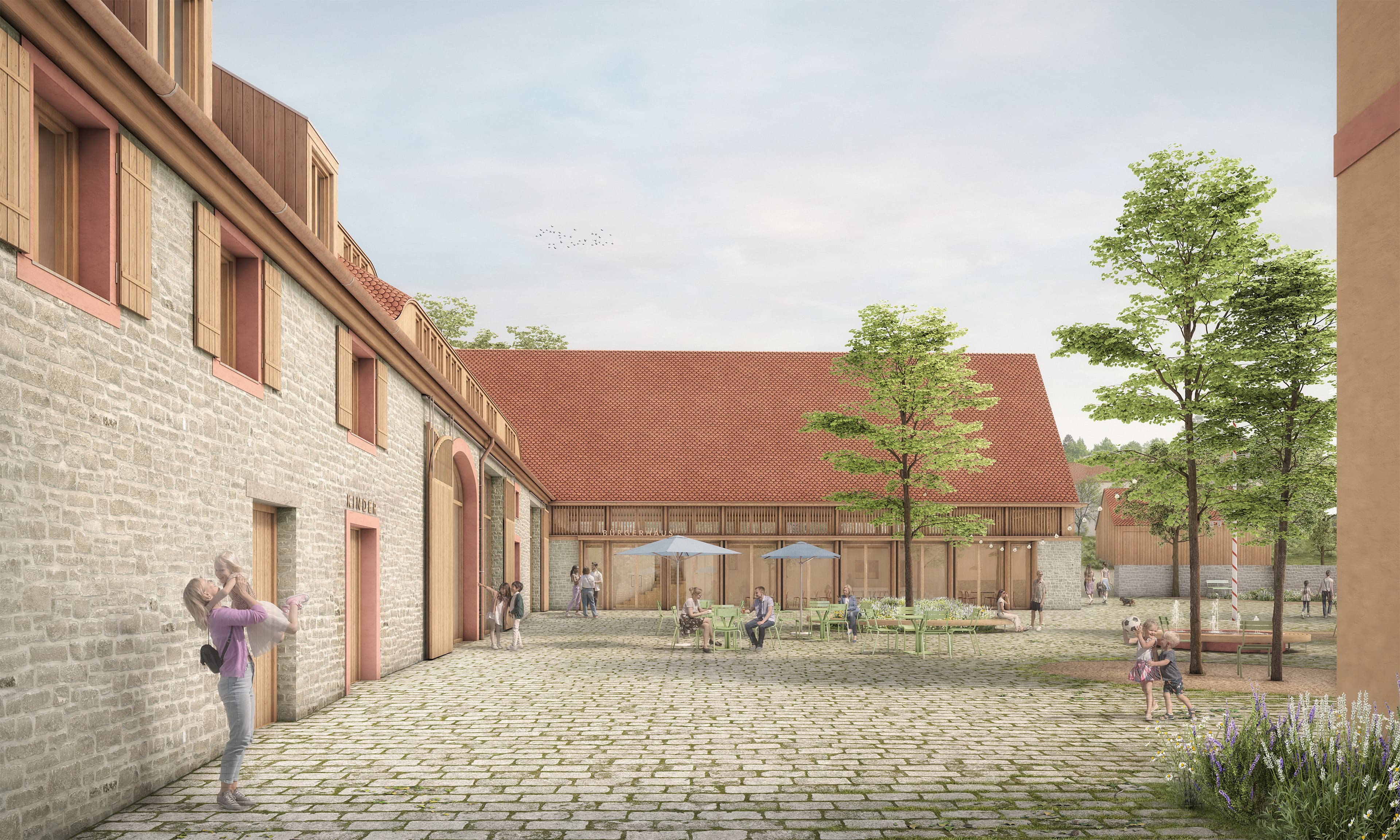 Ein Anbau wird den bestehenden Gebäuden angegliedert und schafft einen öffentlichen und geschützten Dorfplatz mit neuen Sitzmöglichkeiten und einem Garten, der als öffentlicher Raum für Veranstaltungen des Gemeindelebens genutzt werden kann.